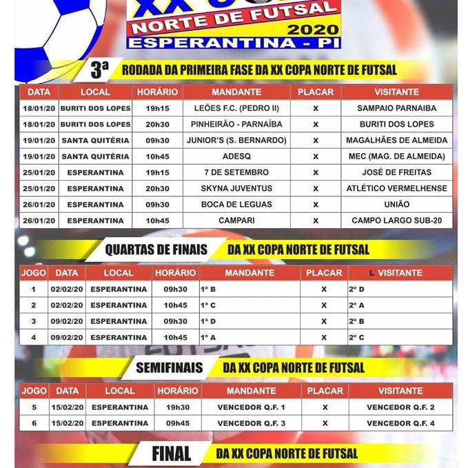 A comissão organizadora da Copa Norte que tem a frente Chaguinha Magalhães realizou domingo, 16 de dezembro, no auditório da Biblioteca Municipal Antonio Otavio de Melo em Esperantina o Congresso Técnico e sorteio dos jogos da primeira fase da XX Copa Norte de Futsal, que nesta edição terá 16 equipes divididas em 04 sedes, sendo 02 em Esperantina.