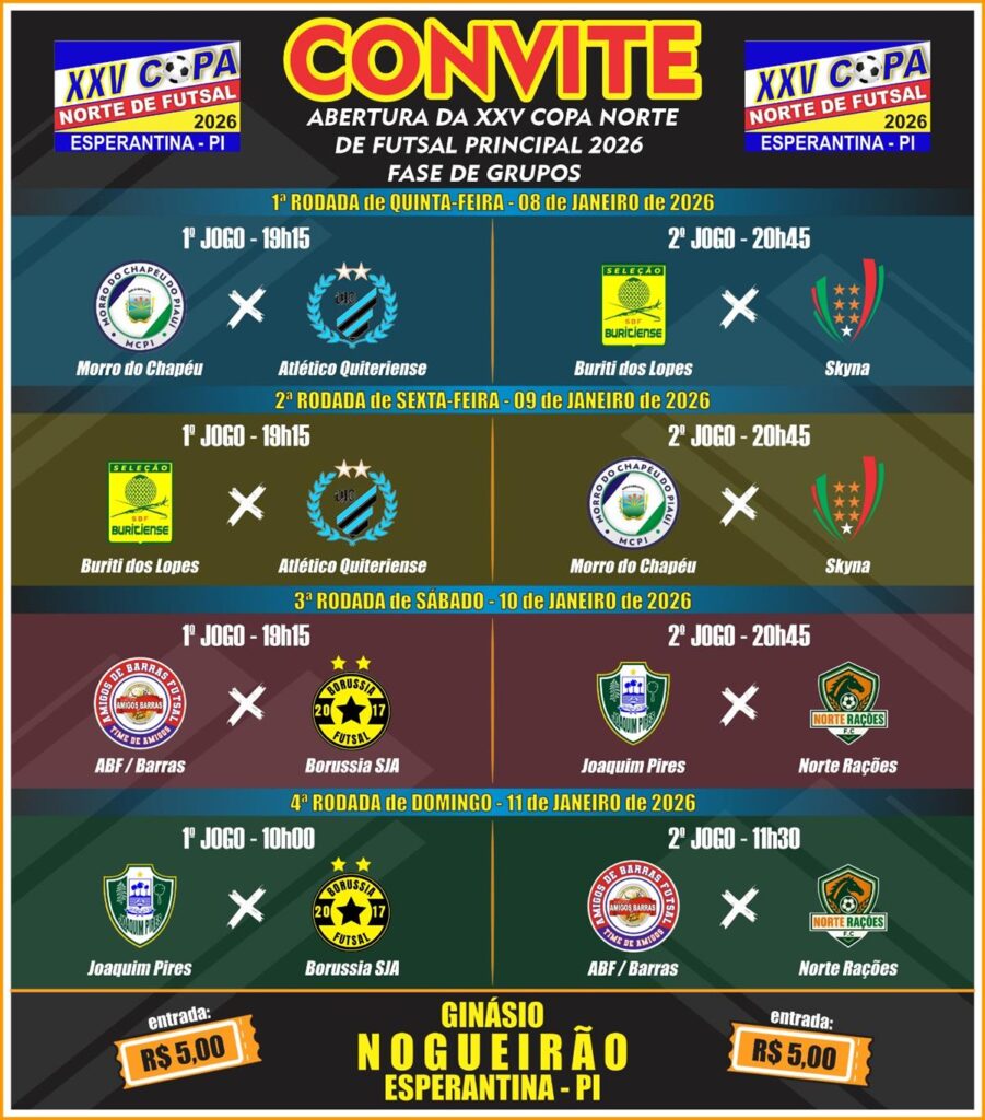 A tradicional Copa Norte de Futsal, um dos eventos mais reconhecidos no cenário do futsal nordestino, tem sua abertura marcada para esta quinta-feira, 08 de janeiro, no Ginásio Nogueirão, na cidade de Esperantina-Piauí. Serão quatro dias consecutivos, com jogos programados para quinta, sexta, sábado e domingo, reunindo as melhores equipes da região.