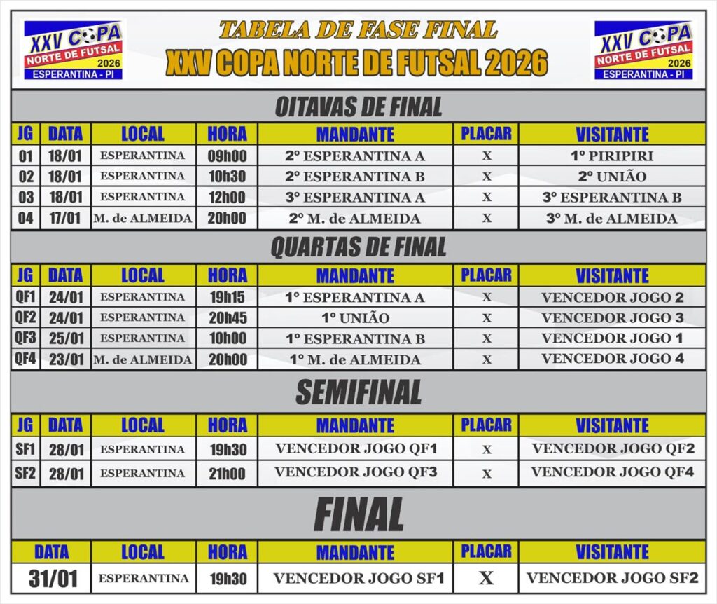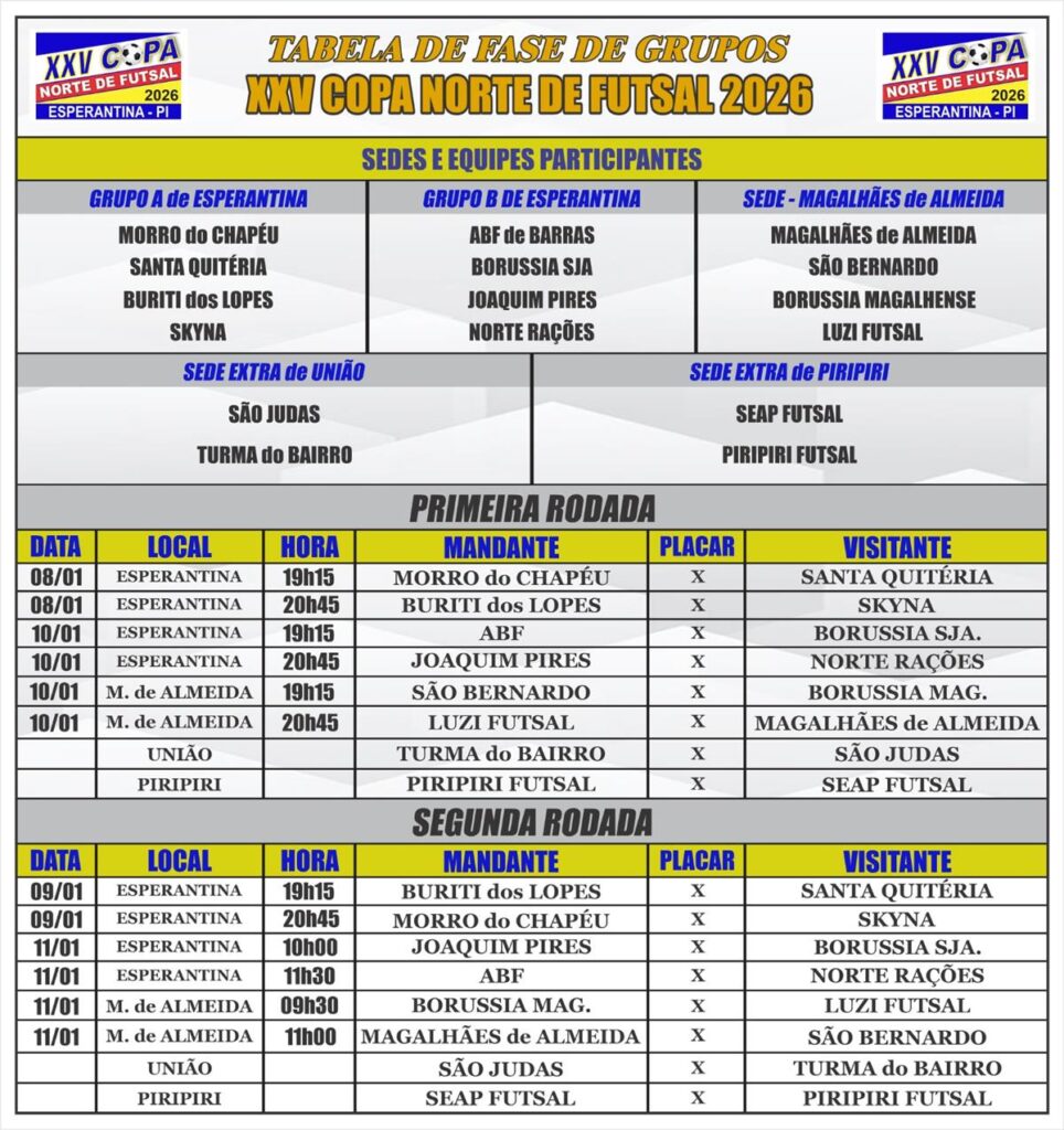 Ainda se define a data dos jogos a serem realizados em União. A competição se estenderá do dia 08 até 31 de janeiro de 2026, prometendo grandes emoções e disputas acirradas para todos os amantes do futsal.