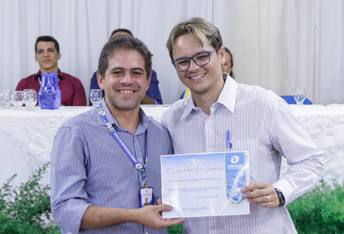 Momento em que foram homenageados por curso: o Enfermeiro Saul de Melo Ibiapina Neres, a Fisioterapeuta Iara Tamires Ibiapina Sousa de Castro, o Farmacêutico Rafael de Castro Andrade Carvalho, a Nutricionista Nájella Kessia Matos Alberto e a Profissional de Educação Física Kiara de Oliveira Monteiro Alves, ficando todos bastante emocionados pelo reconhecimento significativo ao exercício ético e profissionalismo.