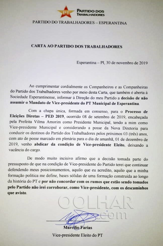 Em carta ao Partido dos Trabalhadores e aberta a sociedade esperantinense, divulgada neste sábado, (30/11), o atual Supervisor de Ensino de Esperantina, Marcílio Farias, comunica que decidiu não assumir o mandato de Vice-presidente do PT municipal de Esperantina.