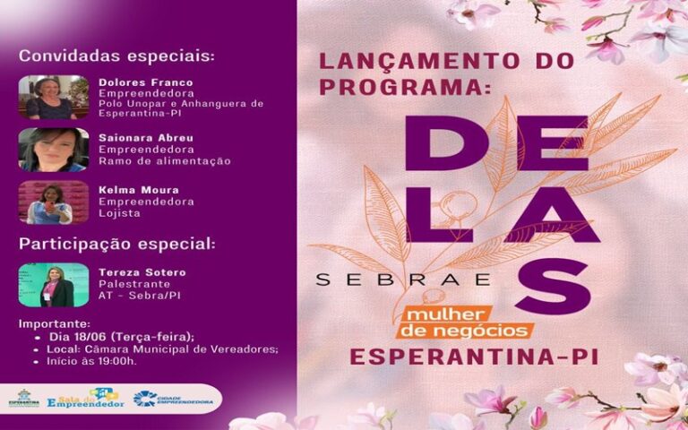 Na próxima terça-feira, dia 18 de junho, será realizado o lançamento do programa “DELAS”, uma iniciativa do SEBRAE voltada para a promoção e apoio às mulheres empreendedoras. O evento ocorrerá na Câmara Municipal de Vereadores de Esperantina-PI, com início às…