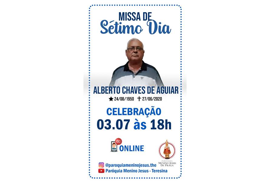 A família de Alberto Chaves de Aguiar, convida familiares e amigos para a celebração da missa de sétimo dia do seu falecimento a ser realizada nesta sexta-feira, 03 às 18h, que será transmitida online pelo instagram e o youtube da Paróquia Menino Jesus de Teresina.